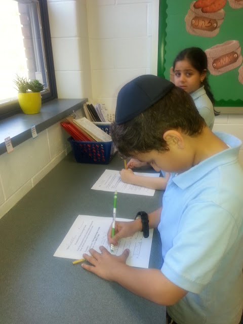 Another hands-on activity involved sentence strips and elbow pasta that we used to represent apostrophes. Children determined if the possessive nouns were singular or plural and where to place the apostrophe, then recorded their answers...